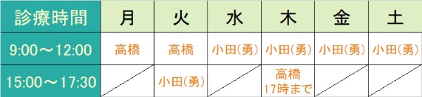 ※木曜日は、第1診察室は午前は(院長)、午後は17時まで(髙橋真実)、第2診察室(副院長)は午前午後